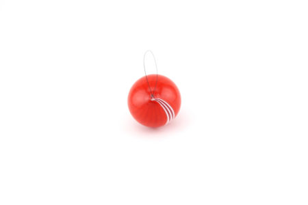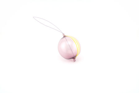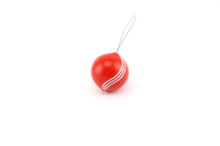 Glass blown Christmas ball, made of pastel red glass and white filigree rods.